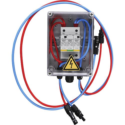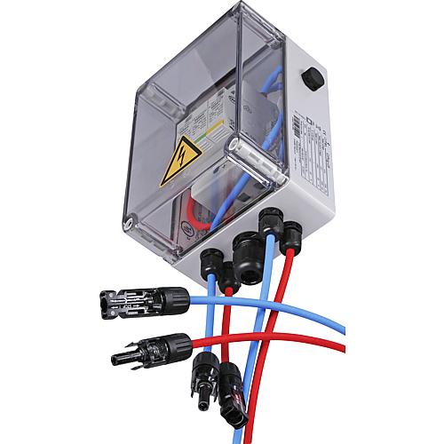 für 1 MPP-Tracker, mit Überspannungsschutz Typ 2, 1x Kabeleinführung M24, 1x Anschlussleitung Eingang 15cm mit MC4-Stecker 1x6mm², 1x Anschlussleitung Ausgang 1,2m mit MC4-Stecker 1x6mm², Erdanschlussklemme 2,5-25mm²