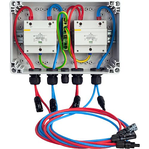 für 2 MPP-Tracker, mit Überspannungsschutz Typ 2, 4x Kabeleinführung M24, 1x Kabeleinführung M12, 2x Anschlussleitung Eingang 15cm mit MC4-Stecker 1x6mm², 2x Anschlussleitung Ausgang 1,2m mit MC4-Stecker 1x6mm², Erdanschlussklemme 2,5-25mm²