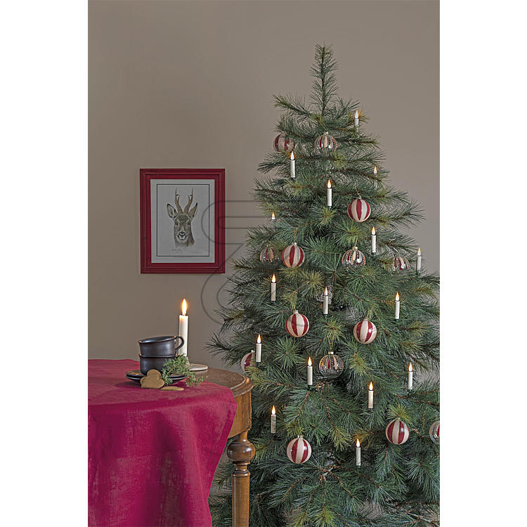 mit Kerzenschaft elfenbein, Höhe 10cm und 12 batteriebetriebenen Einzelkerzen mit warmweißen LEDs zum beliebigen Platzieren am Baum, mit IR-Fernbedienung, 4-stufig dimmbar, Dauer-, Flackerlicht und Timer-Funktion mit automatischer Abschaltung nach 5 Stunden einstellbar, Reichweite ca. 8m, Batteriebetrieb je Kerze 1x Micro und Fernbedienung 2 Micro-Batterien