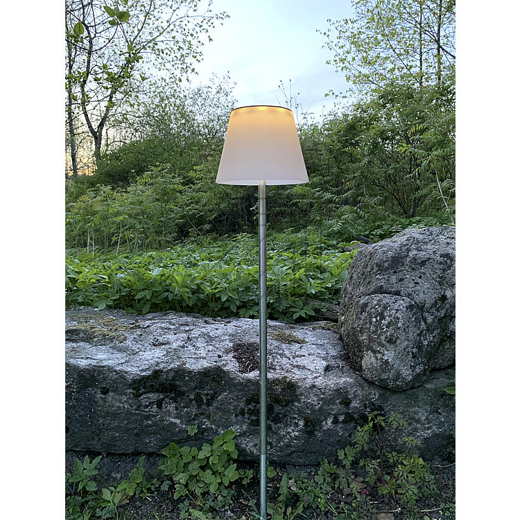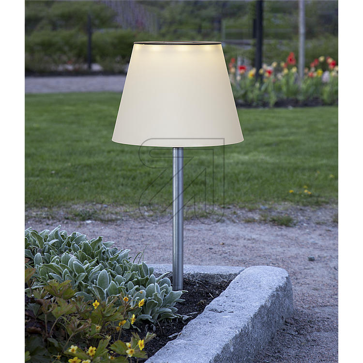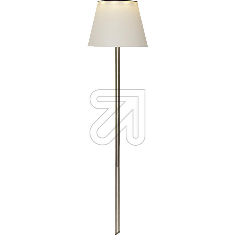 Edelstahl, Schirm Kunststoff weiß, mit Solarmodul, 3-teiligen Erdspieß in verschiedenen Höhen steckbar 30/50/90cm, warmweiße LEDs, Dämmerungsautomatik und NiMh-Akku Micro 1,2V/600mAh, Leuchtzeit bei vollem Akku ca. 6 Stunden